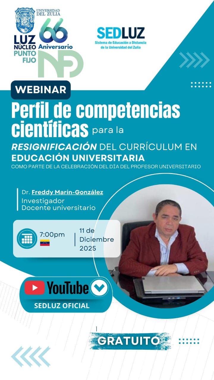 11 Diciembre, 2025Webinar: Perfil de competencias científicas para la resignificación del curriculum en educación universitariaCoordinador: Dr. Freddy Marin GonzálezPrograma: Capacitación SEDLUZ Tipo: Webinar Alcance: Nacional e Internacional Modalidad: On Line (Via Youtube) Período: 2025 / 4 Inscribirse |